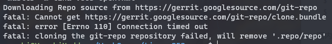 由于谷歌服务器位于国外,每次运行时Repo会检查更新导致下载较慢,国内用户可以配置镜像源。否则会像下图一样卡住不动然后失败。