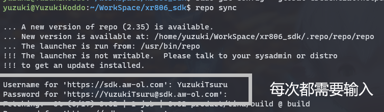 如果提示 Username for 'https://sdk.aw-ol.com': 请输入 全志在线开发者论坛 的用户名和密码。(注:需要全志在线开发者论坛LV2等级以上用户才有权限拉取 SDK)