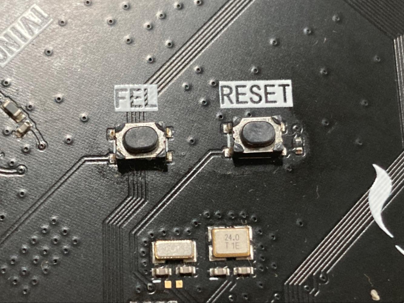 上电状态下,先按住FEL,再点击 RESET 按钮,保持 FEL 不松开,待 PC 连接上开发板后再松开,即可强制进入烧录模式。