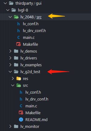 首先我们复制源码,在 platform/thirdparty/gui/lvgl-8 源码文件夹里,把 红色箭头 所指的 lv_g2d_test 的源码作为模板复制到 黄色箭头指向的 lv_2048 文件夹里。