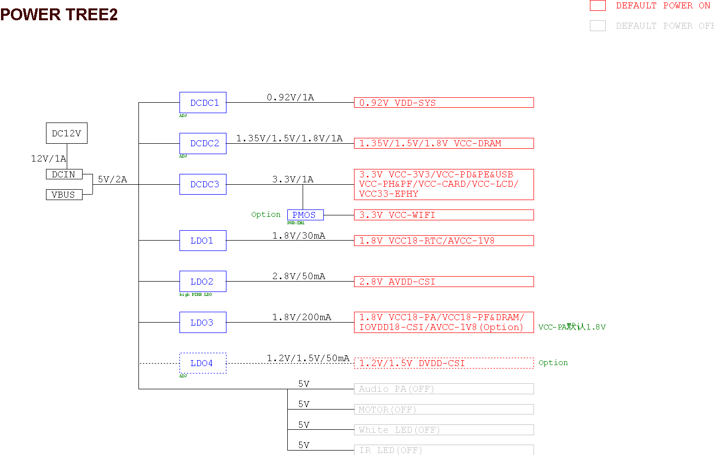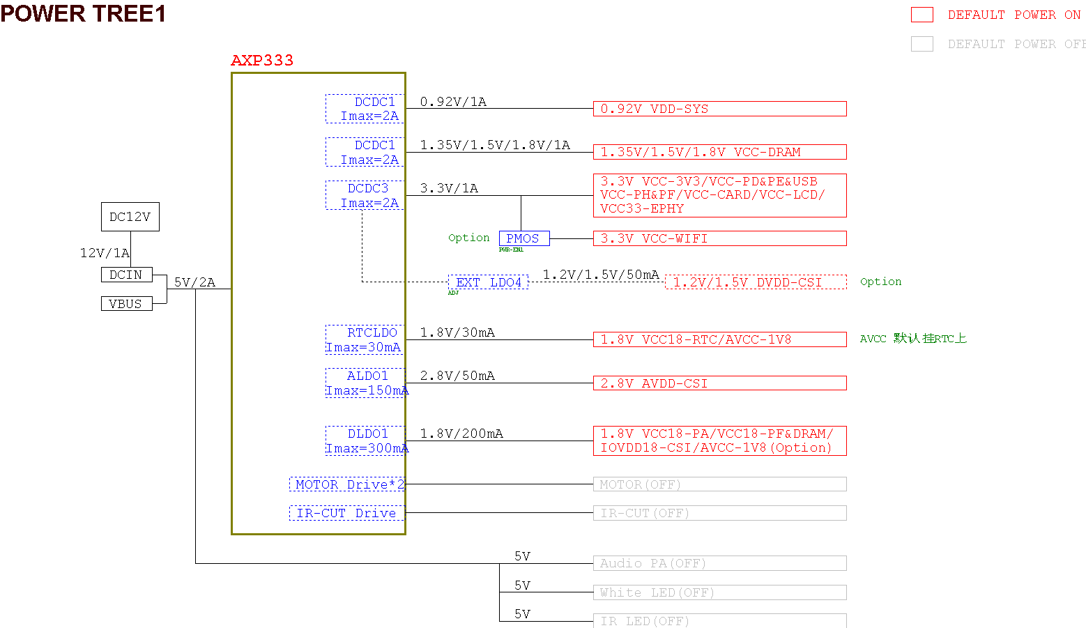 V861/V838-PER1电源方案分为PMU(AXP333)和分立器件方案,对应电源拓扑结构如图所示: