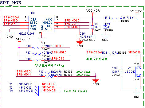 全志开发板Flash可以支持三种Flash类型,分别是SPI NOR(默认贴片)、SPI NAND、eMMC(V861/V838-PER1板卡未预留设计,实际芯片可支持)三种封装形式的Flash,对应开发板位置如图所示,对应原理图如所示: