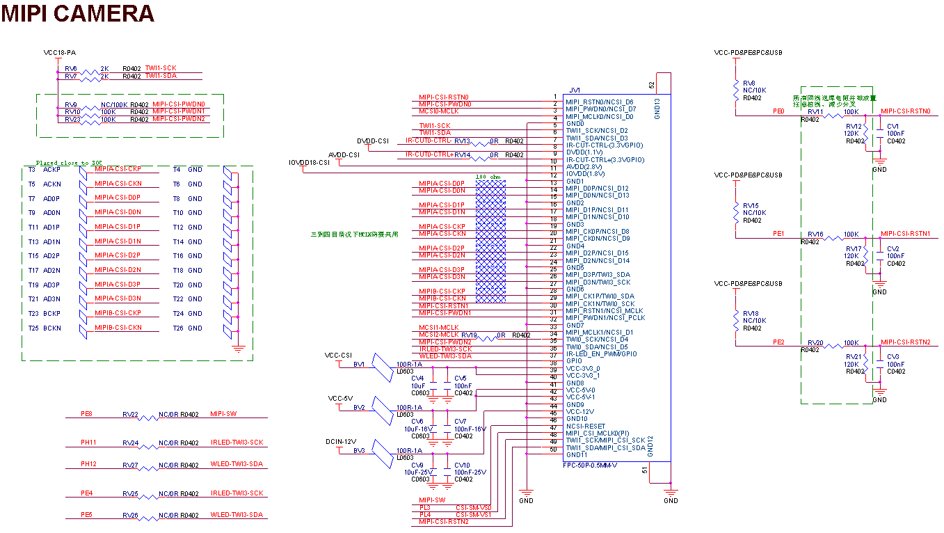 PA为MIPI-CSI,支持3*1lane mipi、2*2lane mipi或者1*4lane mipi,GPIO分配情况如图表所示: