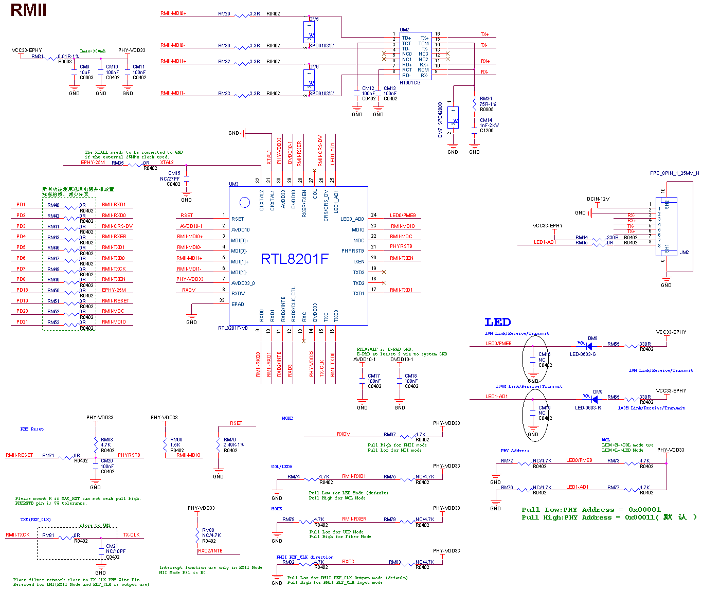 V861/V838-PER1**(贴V861芯片)**开发板支持百兆RMII接口,通过外挂PHY芯片与网口连接,对应GPIO配置如图表红框所示,如图所示为开发板EMAC接口原理图。