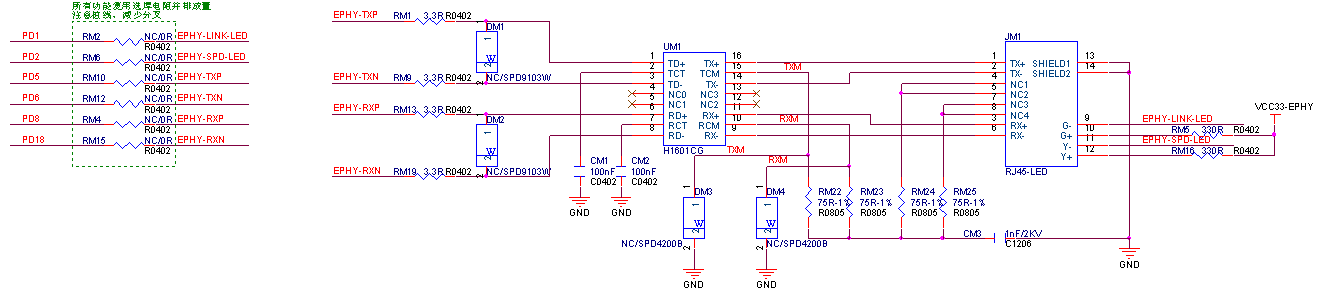 V861/V838-PER1**(贴V838芯片)**开发板支持百兆EPHY接口,内部SIP AC300(PHY)替代外挂方案,对应GPIO配置如图表红框所示,如图所示为开发板EPHY接口原理图。