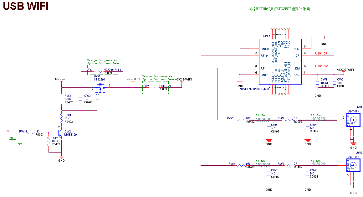 V861/V838-PER1开发板支持外挂USB WiFi模组的设计,对应设计原理图如图所示: Wi-Fi设计原理图