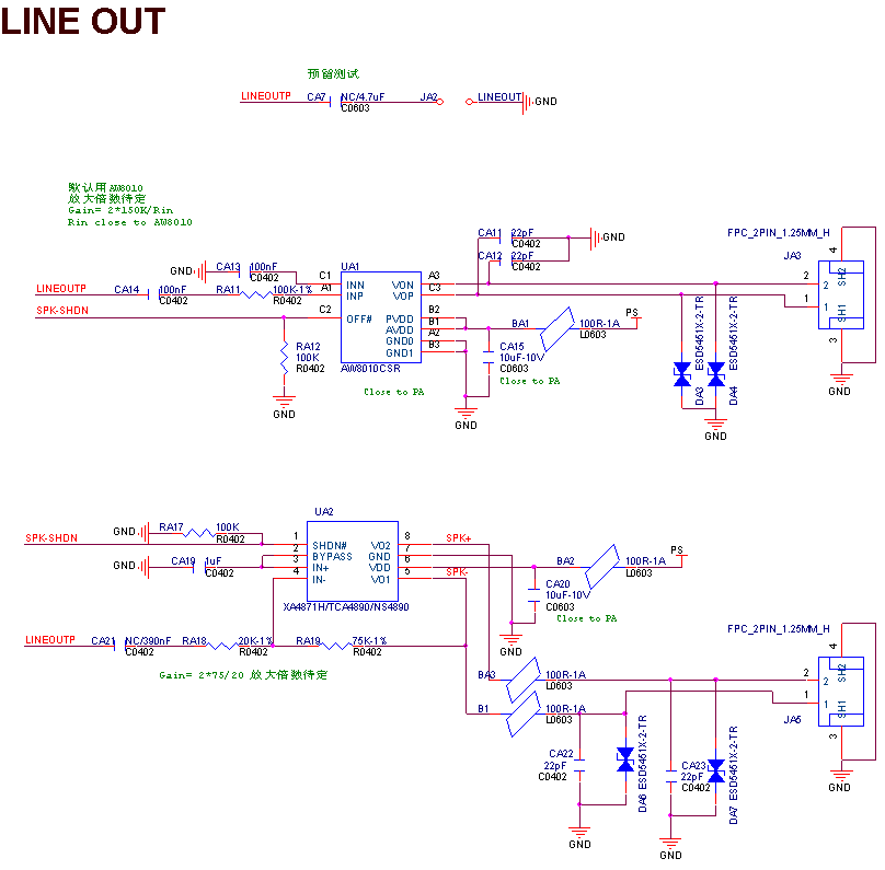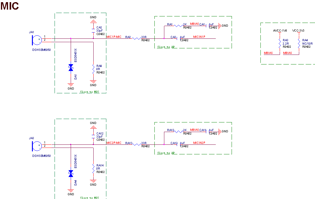 V861/V838-PER1开发板支持两路模拟mic、一路单Lineout,全志开发板对各接口都有引出接口,如图所示为开发板上各Audio接口位置,Audio模块接口设计如图所示: