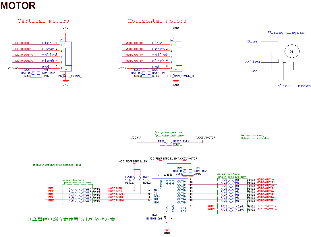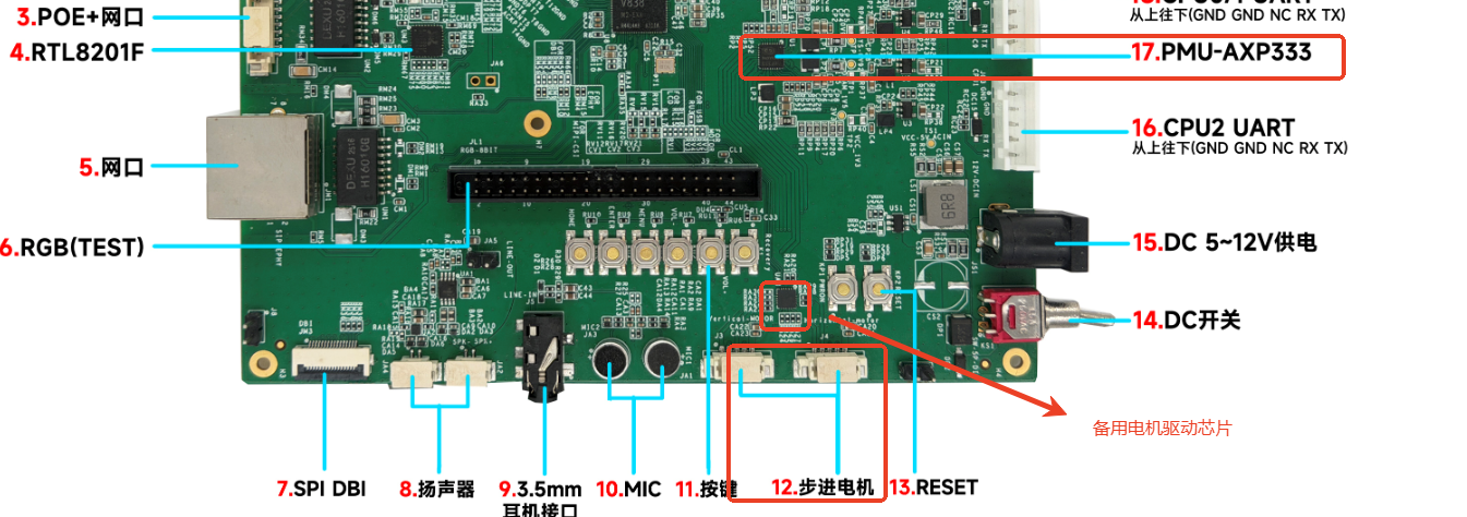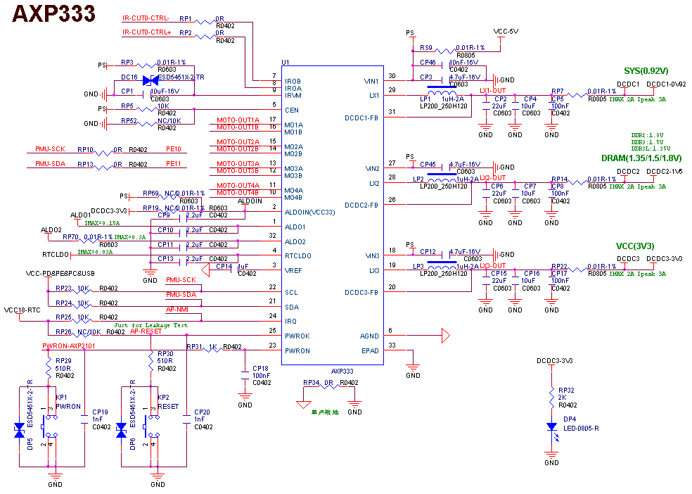 V861/V838-PER1开发板上的PMU-AXP333(PMU具体功能及使用请查阅硬件设指南和对应规格书)支持1CH直流有刷电机或者4CH双路步进电机驱动和一组IR-CUT驱动,如图4-28所示为开发板上电机接口位置,AXP333电机驱动对应设计原理图如图4-29所示,分立器件电源方案对应设计原理图如图4-30所示,分立器件电源方案备用电机驱动对应GPIO配置如图表4-8红框所示: