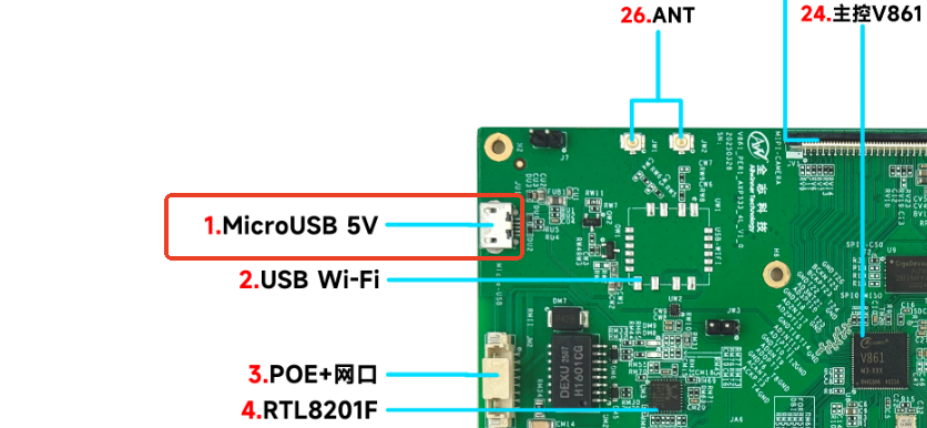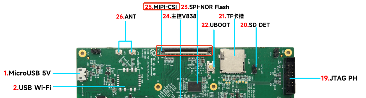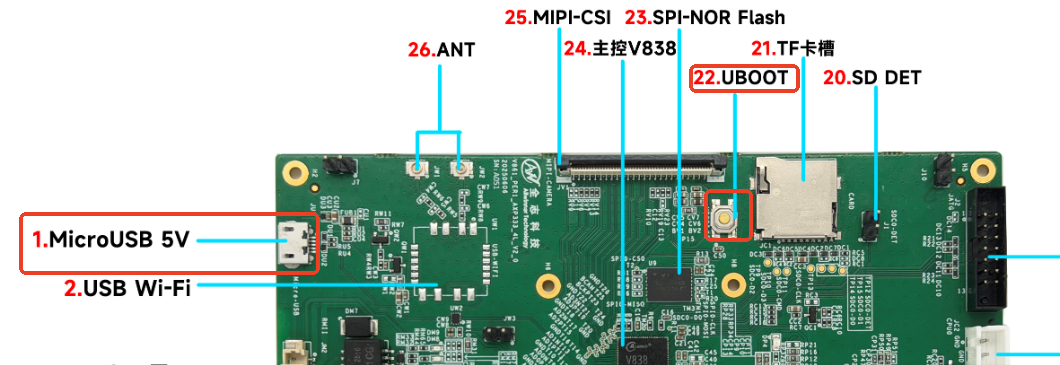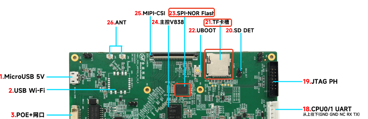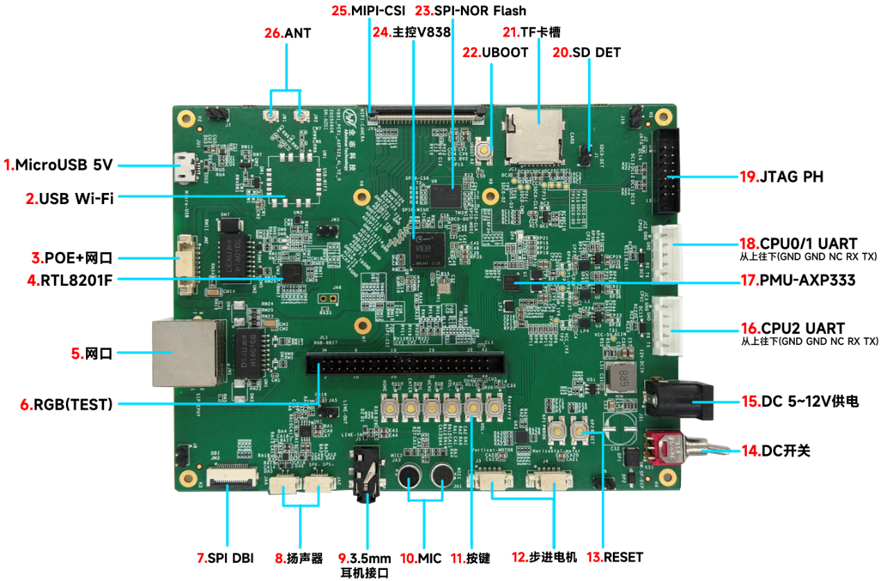 V861/V838-PER1开发板正面接口结构示意图如图所示: