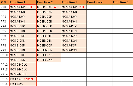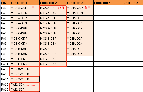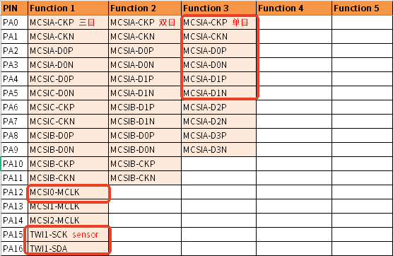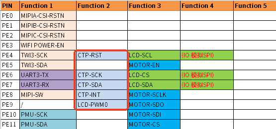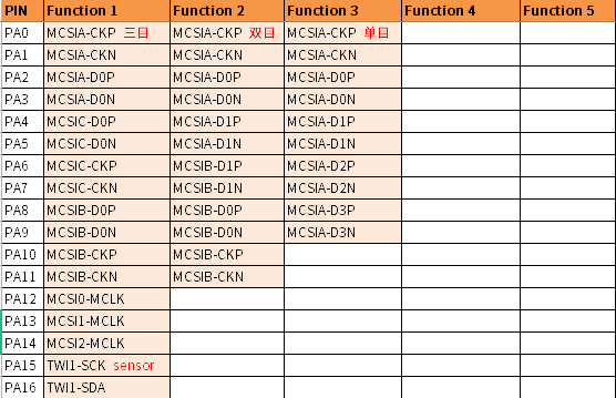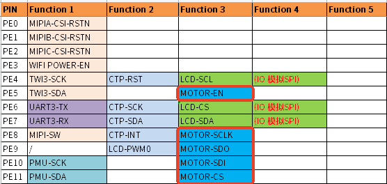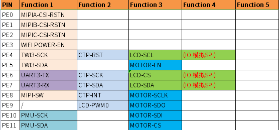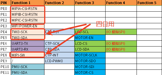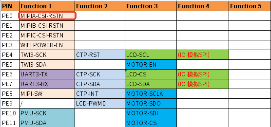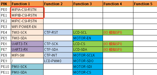 PE口复用功能较多,主要为补充多目MIPI CSI、CTP、电机驱动、UART串口打印、TWI通讯等,GPIO分配情况如图表所示: