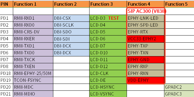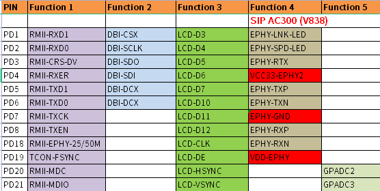 PD口为RMII、SPI-DBI、LCD-RGB 8bit、EPHY(仅V838M2-EXX芯片带EPHY功能,且PD口只有该功能),GPIO分配情况如图表所示: