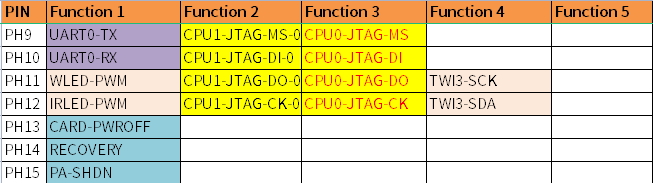 PH口为模块功能补充接口,主要为UART0打印功能、JATG、TWI通讯、喇叭、卡开关控制等接口,GPIO分配情况如图表所示:
