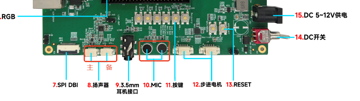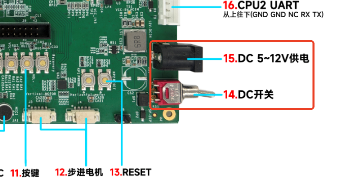 | 15 | DC5~12V电源输入口(默认使用12V) |