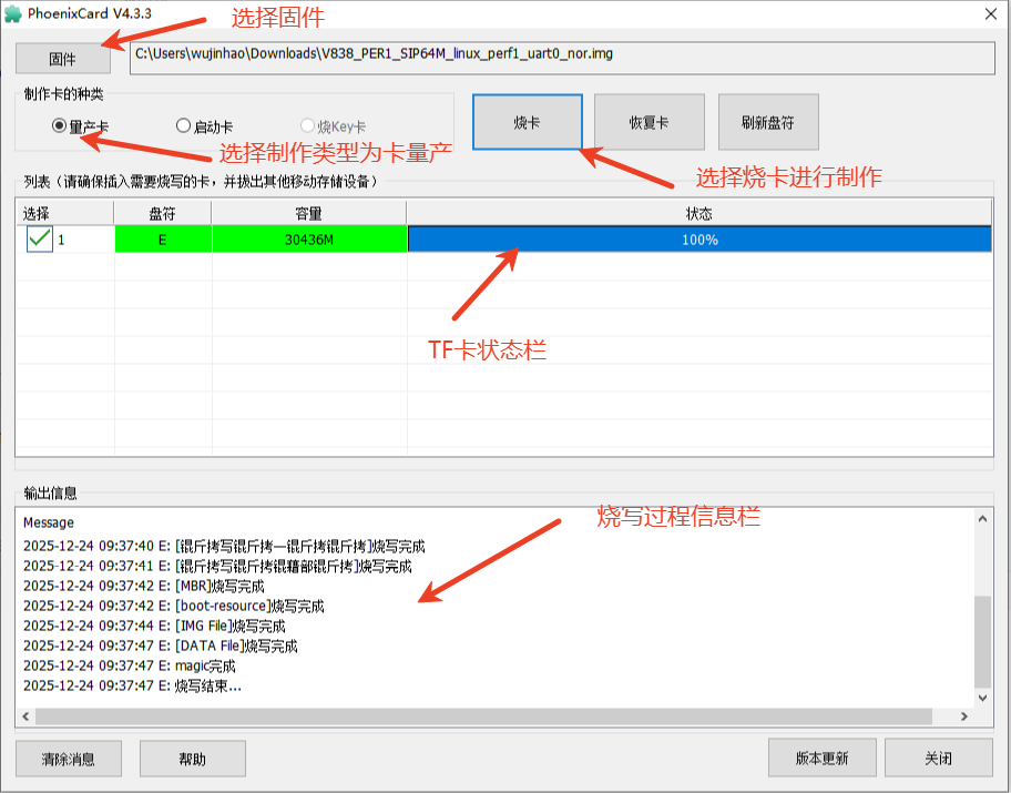 1、打开PhoneixCard工具,点击固件,选择需要烧写的固件,把TF卡通过读卡器接到电脑上,此时工具输出信息栏会显示找到盘符,对应列表内页会显示TF卡的状态;