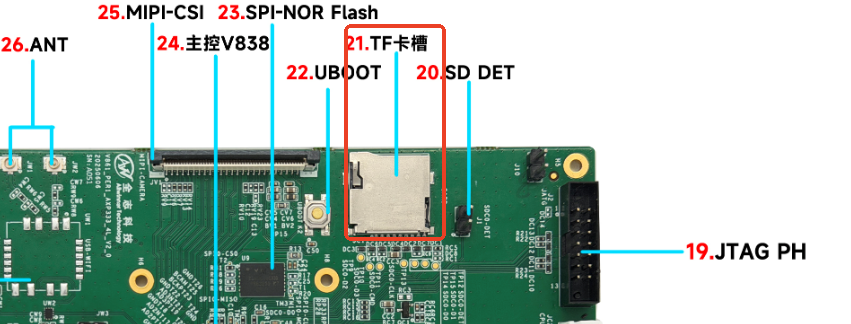 5、制作完成后,取下TF卡,并插到开发板TF接口上,如图所示,原理图如所示,对应GPIO配置如图表红框所示: