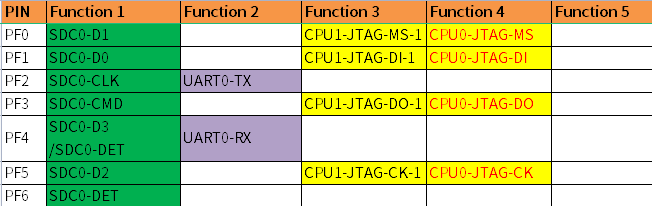 PF口为SD卡接口,支持SDIO3.0、JATG功能,同时也复用了UART0打印功能,GPIO分配情况如图表所示: