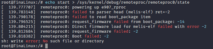 可以看到,由于我们没有加载固件,小核启动失败。此时我们需要把准备好的固件放置到开发板的 lib/firmware 文件夹内。这里我们使用 adb 上传小核固件。