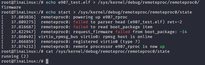 echo e907_test.elf > /sys/kernel/debug/remoteproc/remoteproc0/firmware
